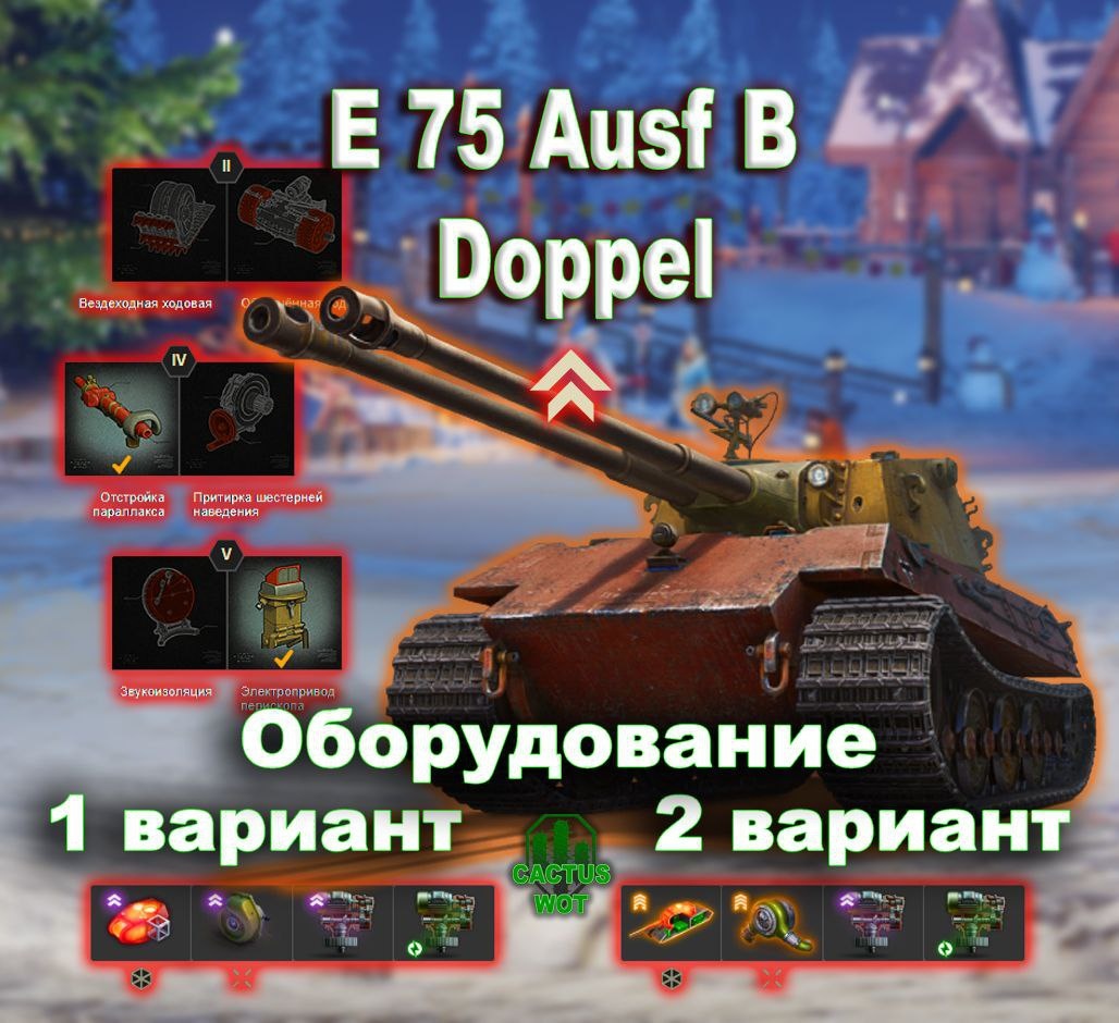 🇩🇪E 75 Ausf B Doppel 🏦Тяжелый танк прорыва 8 уровень. Германия. 🔼Оборудование и полевая модернизация на картинке🔼 🛻ОСНОВНЫЕ ТТХ: • Урон: 280/280/370 • Пробитие: 221/270/44 мм • Перезарядка: 7 сек • Подготовка залпа: 2 секунды • Время между выстрелом и переходом к заряженному орудию: 2,5 секунды • Сведение: 2.8 сек • Разброс: 0.34 м/100м • УВН: -6°/20° • Прочность: 1500 HP • Броня башни: 250/120/60 мм • Броня корпуса: 160/120/120 мм • Скорость: 35/15 км/ч • Обзор: 390 м ➕Плюсы 📈Залп на 560 урона 📈Хорошее пробитие 📈Отличный обзор ➖Минусы 📉УВН -6° 📉Долгое сведение ⬇️⬇️⬇️⬇️⬇️⬇️⬇️⬇️ #базазнаний@CactusWOT #Doppel@CactusWOT #миртанков