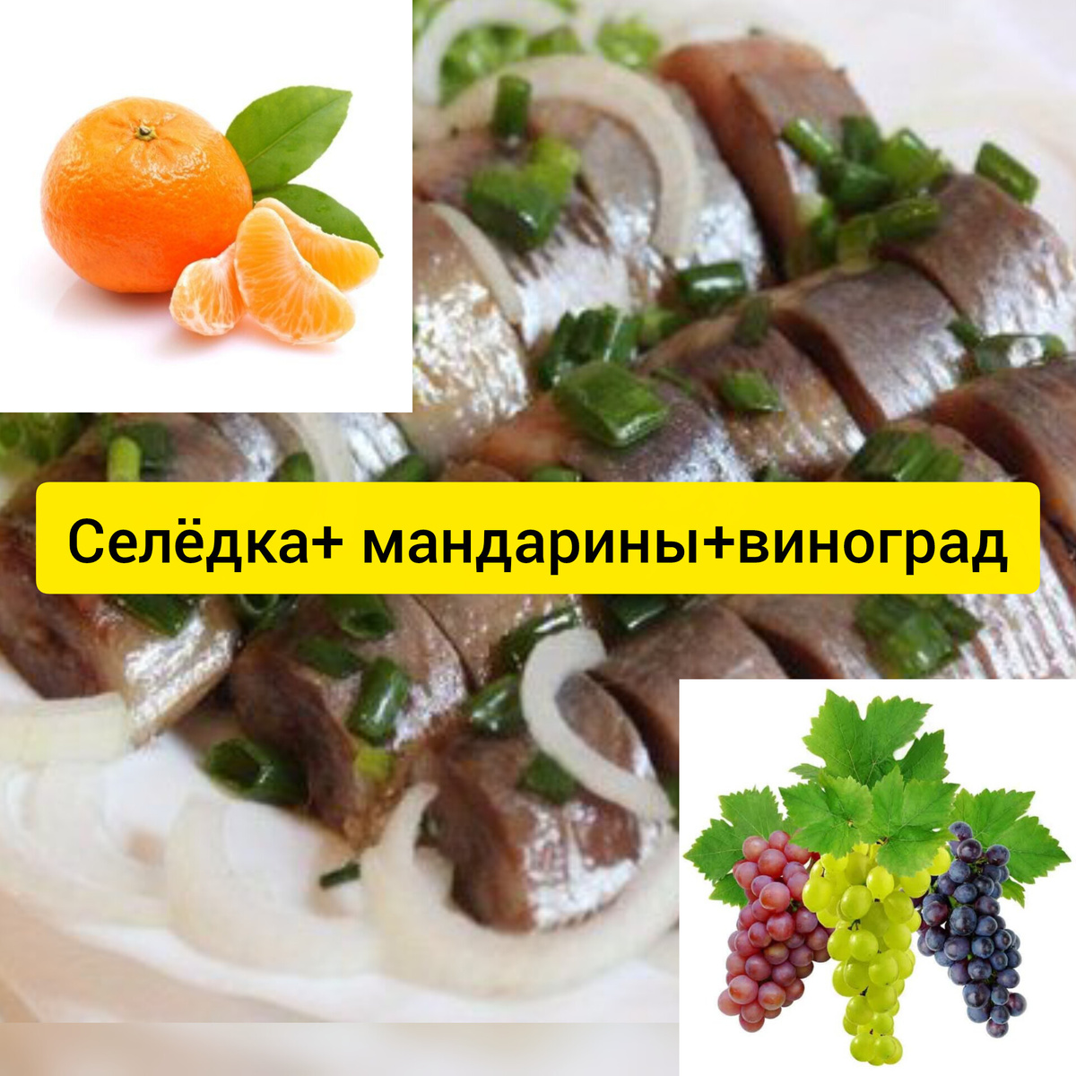 ### Ингредиенты: * **Сельдь слабосоленая** — 300 г * **Мандарины** — 3–4 шт * **Кедровые орешки** — 50 г * **Виноград без косточек** — 200 г * **Красный лук** — 1 шт * **Натуральный йогурт** или майонез — для заправки * **Зелёный лук** — по желанию ### Приготовление: 1. **Подготовка ингредиентов**: * Сельдь очистить от костей и нарезать кубиками * Мандарины очистить от плёнок и разделить на дольки, затем нарезать кубиками * Виноград разрезать пополам * Красный лук мелко нашинковать * Кедровые орешки слегка обжарить для усиления аромата 2. **Сборка салата**: * В большой миске соединить все подготовленные ингредиенты * Заправить йогуртом или майонезом * Посолить и поперчить по вкусу * Аккуратно перемешать ### Подача: Перед подачей украсить мелко нарезанным зелёным луком. Салат лучше подавать сразу после приготовления, чтобы мандарины не успели дать слишком много сока. ### Особенности: Солёность сельди прекрасно уравновешивается сладостью мандаринов и винограда, а хрустящие орешки