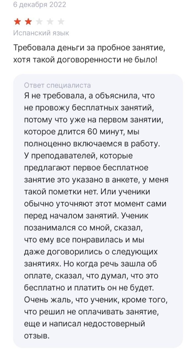 ↗ 💸Бесплатное пробное занятие Стоит ли его проводить или каждый час работы педагога должен быть оплачен? Внизу можно ознакомиться с несколькими мнениями, как учителей, так и учеников: * Не считаю нужным оплачивать пробное занятие, потому что как правило учитель долго рассказывает о себе/коте/муже/детях, а в некоторых ситуациях и о своих проблемах. Я не психолог и плачу за знания, а не за ненужную информацию. Если я захочу узнать о педагоге- я почитаю его анкету на сайте агрегаторе. * Считаю что наиболее рационально- брать оплату как за половину урока. Если ученику что-то не понравится- он просто не продолжит занятия со мной. Заниматься бесплатно тоже не вижу смысла- в конце концов, я добросовестно выполняю свою работу. * Беру деньги за пробное только если ученик точно продолжит заниматься со мной. Если что-то не понравилось- мы прощаемся и никто никому ничего не должен. Так будет меньше оснований писать мне плохие отзывы- я же не взял оплату за урок. *…