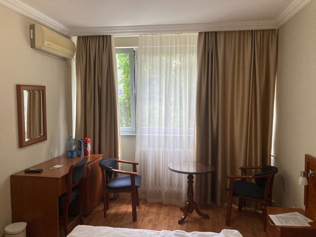 В сентябре 2025 года мы посетили в Белград и остановились в гостинице "Rex". Привлекли нас невысокая стоимость и расположение. Отсюда пешком 15-25 минут до центра, около 20 минут до набережной Дуная и столько же до автобусных остановок из и в аэропорт имени Николы Теслы. Номер оказался прокуренным - в Сербии эта вредная привычка разрешена везде, и вроде в отелях её стали отменять не так давно. В любом случае, курево из стен уже не выветрится никогда, проще снести здание. Номер оказался ещё и относительно просторным: здесь помещаются платяной шкаф, две кровати, письменный стол со стулом, две тумбы, журнальный столик с двумя креслами. Чайника нет: сербы предпочитают кофе. Санузел маленький, раздолбанный, но не такой жуткий, как в Avsin Apart Hotel в Стамбуле. Пользоваться можно. В стоимость номера входит завтрак - шведский стол. Яичница, мясная нарезка, пластмассовые овощи. Из приятного - фрукты, йогурты, кексики. Есть разбавленные соки, кофе, молоко. Приехали мы в Белград очень р