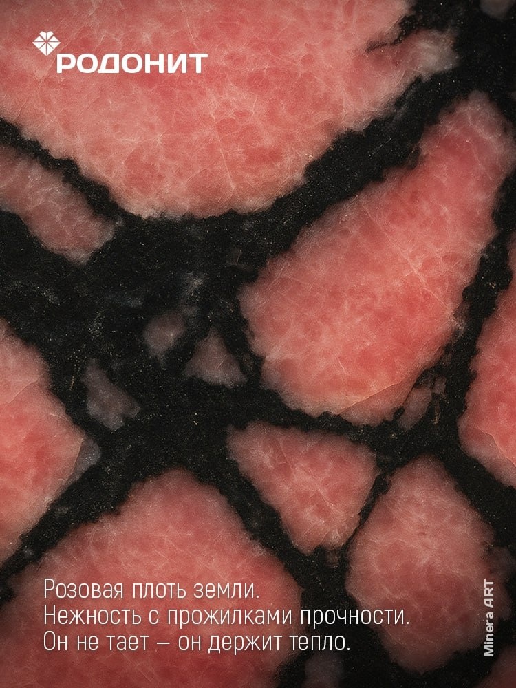 Родонит — камень с оттенком живой плоти: розовый, с прожилками чёрного и серого. Его цвет не кричит — он дышит. В нём есть тепло, но и твёрдость: как кожа, которая умеет быть мягкой и прочной одновременно. На ощупь он прохладный, плотный, гладкий. В каждом камне свой рисунок: где-то больше розового, где-то тёмные линии словно собирают его в узор. Родонит не идеален, и именно в этом его притягательность — он живой, разный. Держишь его в руке — и ощущаешь простую фразу: «Я могу быть нежной и сильной одновременно». ___________ Minera ART — направление, в котором мы пробуем почувствовать каждый минерал — и делимся результатом в своей группе.