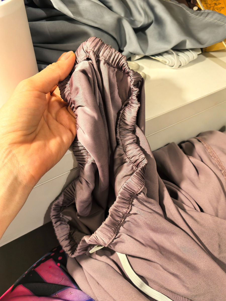 1. Резинка вшитая в пояс растянулась. Может от сушки в сушильной машине, может просто от стирки.