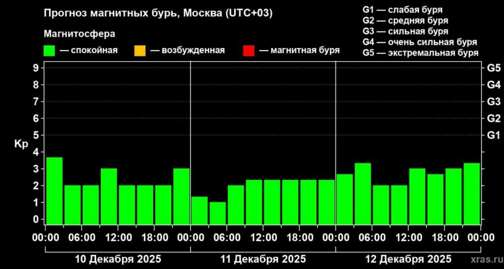 Сегодня геомагнитная обстановка на Земле остается спокойной — магнитные бури, которых ожидали ранее, не произошли. Как сообщил ведущий специалист центра погоды «Фобос» Михаил Леус, облако солнечной плазмы, выброшенное в ночь с 6 на 7 декабря, не достигло нашей планеты. По обновленным данным международных прогностических центров, это облако прошло мимо Земли, и в ближайшие дни никаких серьезных возмущений в магнитосфере не предвидится. По крайней мере до конца рабочей недели геомагнитное поле будет оставаться в так называемой «зеленой зоне» — от спокойного до неустойчивого уровня. Михаил Леус отметил, что и минувшей ночью не фиксировалось никаких возмущений. Облако солнечной плазмы прошло мимо, и геомагнитное поле останется в пределах нормы, — уточнил он. Ранее «Краснодарские известия» писали, мощная магнитная буря обрушится на Землю в ночь на 9 декабря.