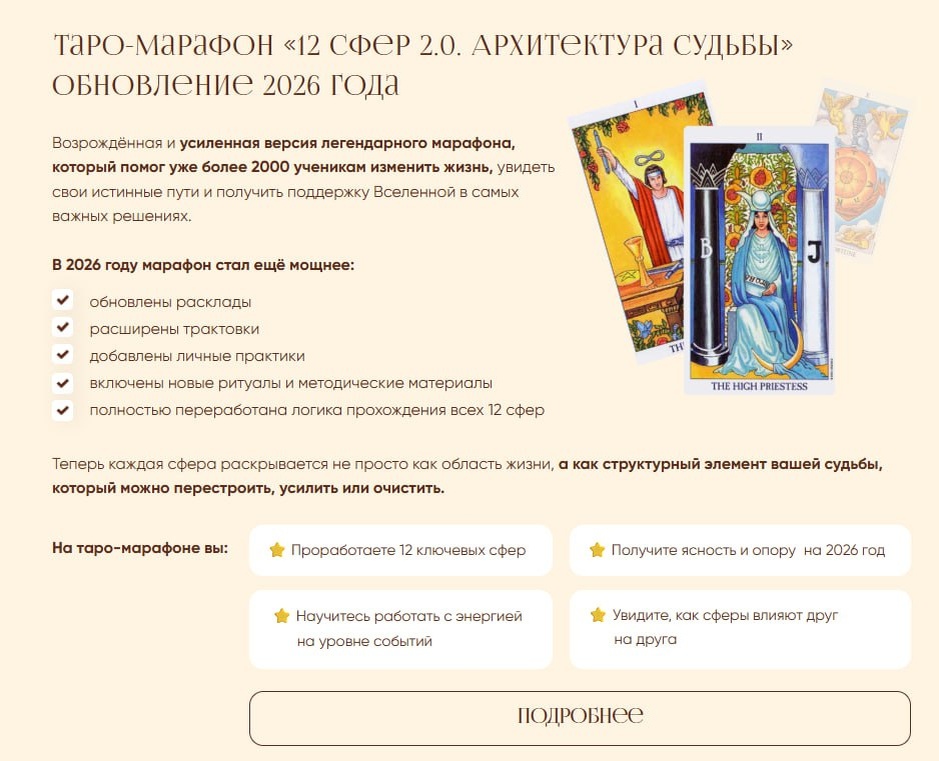 🎡ЗАПУСКАЕМ КОЛЕСООО 🎡 Друзья, запускаем обновленные программы, чтобы вы вошли в 2026 чистеньким и с огоньком в глазах. Что мы для вас приготовили? 1. 🔥Таро-марафон «12 сфер. Архитектура судьбы 2.0» 🔥 Пройдитесь по всем 12 сферам своей жизнь в энергиях Таро. Проживать 12 сфер надо не только поле дня рождения, но и перед вхождением в новый цикл года 🤓 Проработаем 12 ключевых сфер: Человек Деньги Контакты Корни Дети и творчество Здоровье Супружество Партнёрства Мировоззрение Путешествия Карьера Друзья Мистика и тайны жизни + новые расклады + новые трактовки + новые ритуалы + новые методические пособия 2. 🔥Мастер-классы по магическим свечам🔥 4 новые свечи специально для вас, мои рукодельницы! Свеча "Теплый дом" Свеча "Деньги меня любят" Свеча "Сердце в балансе" Свеча "Чистое поле" Рассказываю где и как заказывать материалы. 3. 🔥Комбинированный пакет «Свечи + Таро»🔥 Самая глубокая версия. Доступ 6 месяцев. При любой покупке вы автоматически становитесь участником беспроигрышн
