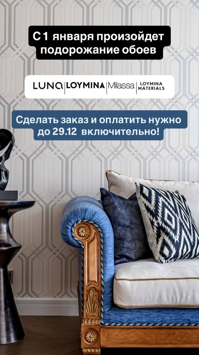 🤩🤩🤩🤩🤩🤩🤩🤩🤩🤩🤩 🤩🤩🤩🤩🤩⚡️ Друзья, фабрика Loymina объявила о подорожании обоев с 1 января: Luna, Loymina, Milassa, Loymina Materials. Чтобы успеть купить по старой цене необходимо сделать и оплатить заказ до 29.12 включительно! Чтобы сделать расчет и узнать подробности, напишите нам @rdeco40 👈