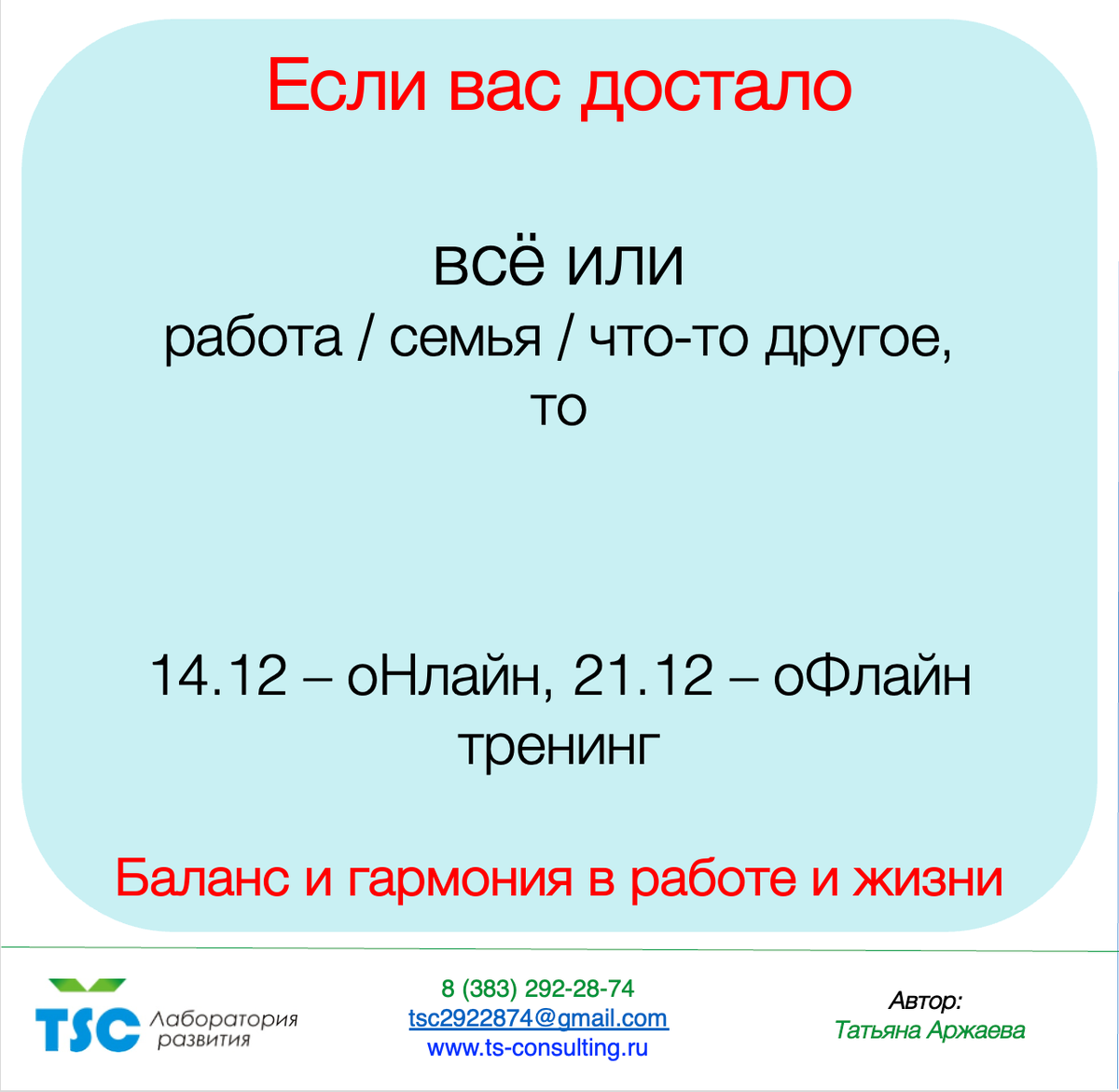 И если вас все или что-то одно достало (работа / дом / другие варианты), то добро пожаловать на тренинг Баланс и гармония в работе и жизни · Практики и ключи к практикам. · Ответы на вопросы. · Масса полезной информации. Программа тренинга: 1. Что такое баланс - суть понятия и как его обрести? Практики. 2. Что дает баланс, возможности баланса? Роль баланса. 3. Мифы о балансе. 4. Причины потери баланса и способы его возврата. 5. Что такое гармония и как ее достичь? Практики. 6. Что дает гармония, возможности гармонии? Роль гармонии. 7. Мифы о гармонии. 8. Причины потери гармонии и способы его возврата. 9. Как обрести гармонию и баланс в работе и жизни? Практики. 10. Мифы о работе и жизни. 11. Целостность, тишина и их взаимосвязь с гармонией и балансом. 12. Центр – что это такое и его взаимосвязь с гармонией и балансом. 13. Сознание – что это такое и взаимосвязь с гармонией и балансом. Стоимость для 1 человека и дата, формат проведения: 14 декабря 2025 года – оНлайн, 4