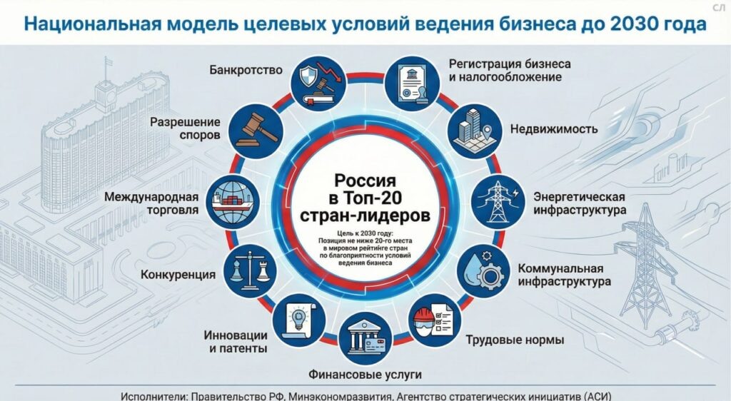Российские власти вновь взялись за улучшение бизнес‑климата: утверждена национальная модель целевых условий ведения бизнеса. Строительная отрасль в ожидании чудес. В очередной раз правительство Российской Федерации решило осчастливить бизнес‑сообщество — на этот раз с размахом. Распоряжением от 29 ноября 2025 г. № 3523‑р утверждена национальная модель целевых условий ведения бизнеса. Цель амбициозная: к 2030 году вывести Россию не ниже чем на 20‑е место среди мировых лидеров по благоприятности предпринимательской среды. Звучит внушительно — почти как обещание построить коммунизм к назначенному сроку. Что это за модель такая? По заверениям авторов, новая национальная модель — это: система ключевых показателей эффективности (чтобы было чем отчитываться); комплекс мер («дорожных карт») для достижения целей до конца десятилетия (чтобы было что пересматривать); инфографика (чтобы выглядело наглядно и убедительно).