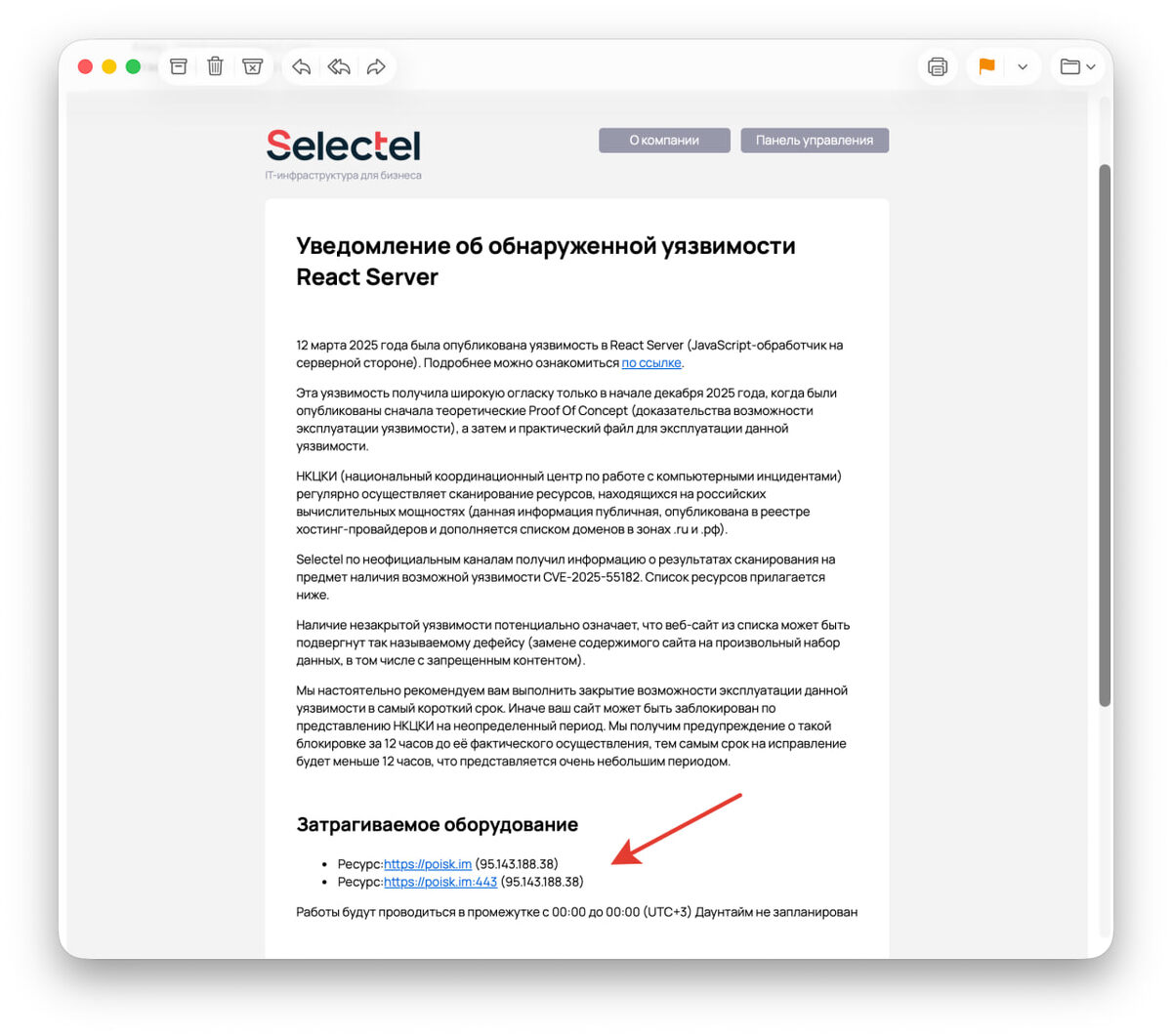 Слышали про уязвимость в React? Хостер нам прислал, просканировал наши ресурсы, нашел уязвимость и прислал уведомление