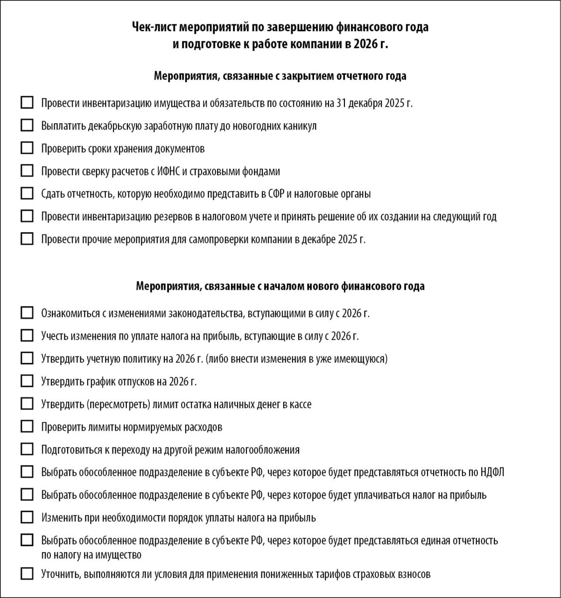 ✏️ Читайте в декабрьском номере журнала «Справочник экономиста» Что нужно сделать экономистам и бухгалтерам до 1 января 2026 года? Декабрь — насыщенный работой месяц и для бухгалтерии, и для экономического отдела. Только профессионально грамотная и своевременная подготовка к закрытию года позволит компании сформировать корректную годовую отчетность, а также подготовиться к изменениям в сфере учета и отчетности, действующим с 2026 г. Из статьи, опубликованной в новом номере журнала «Справочник экономиста», вы узнаете: что необходимо сделать в связи с закрытием отчетного года; какие действия нужны, чтобы начать работу в новом году; какие моменты надо учитывать при проведении мероприятий, связанных с закрытием и открытием отчетного года; что следует утвердить в конце года. Скачать статью можно по ссылке