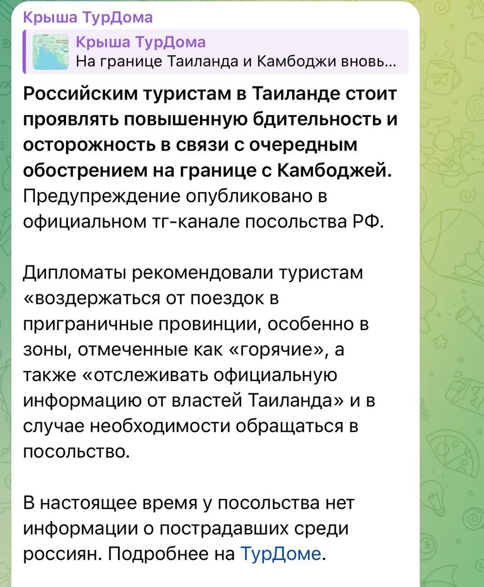 Я только что вернулась из инфотура в Паттайю. Да-да, той самой Паттайи, про которую в новостных чатах пишут, будто там уже вовсю летят снаряды и туристов эвакуируют вертолётами. Сижу, ем привезенные из Таиланда сочные манго, и мне приходят комментарии с воплями: Ладно, Оксана, дышим глубже. Давайте разбираться на трезвую голову и с улыбкой. Что вообще происходит? Да, конфликт на границе есть. Да, он периодически обостряется, последний раз в конце июля. Да, посольство РФ рекомендует проявлять бдительность и не ездить в приграничные зоны. Но ключевое слово здесь - «приграничные». Популярные курорты - Паттайя, Пхукет, Ко Чанг находятся за сотни километров от зоны конфликта. До той же Паттайи от границы около 500 км. Это как от Москвы до Твери и обратно. Снаряды на такое расстояние, к счастью, не летают. Мой личный опыт Буквально на днях я была в провинции Трат, той самой, про которую пишут в новостях. Именно из Трата мы на пароме отправились на райский остров Ко Чанг. Видела ли я ка