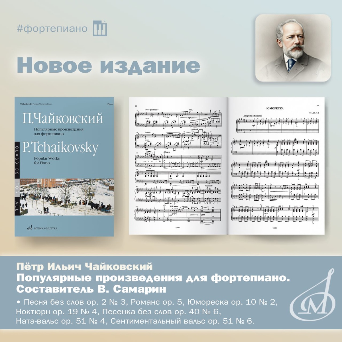 🎹Новинка для пианистов: П. И. Чайковский. Популярные произведения для фортепиано В сборник вошли самые известные и любимые публикой фортепианные миниатюры композитора. Пьесы доступны не только студентам колледжей, но и учащимся ДМШ. Концертирующие исполнители нередко включают их в свои программы в качестве бисов. *️⃣Фортепианные миниатюры Петра Ильича Чайковского образуют особый пласт его наследия и позволяют проследить эволюцию композиторского мышления от 1860-х к началу 1880-х годов. Сборник, составленный Владимиром Аркадьевичем Самариным (подробнее о нём см. здесь), — своего рода музыкальный портрет Чайковского-пианиста, запечатлевший и ранние лирические опыты, и сочинения зрелого стиля. В издание вошли пьесы разных жанров — от романса и ноктюрна до юморески и вальса, показывающие нам, как композитор переосмыслял популярные формы своего времени. • Песня без слов, op. 2 № 3 завершает цикл «Souvenir de Hapsal» для фортепиано, написанный летом 1867 года в Хаапсале (до 1918 года — Г
