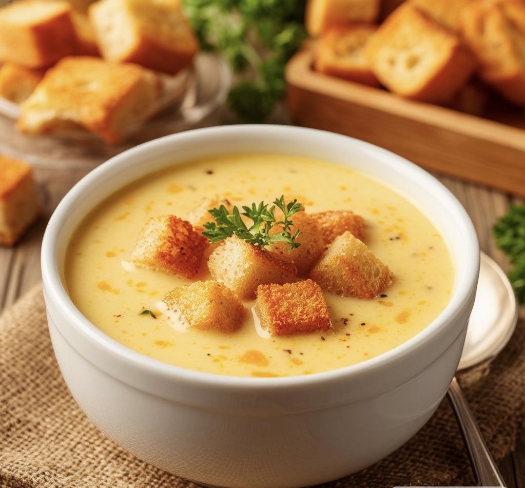 Этот сырный суп с хрустящими гренками — идеальный выбор. Нежная сливочная текстура, насыщенный сырный вкус и ароматные гренки создают идеальное сочетание. Готовится быстро из простых ингредиентов, а результат превзойдёт ожидания! Время: 40 минут