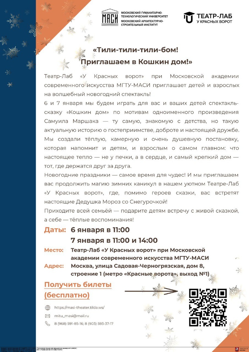 🎭🎄 Новогоднее Чудо от Театра-Лаб "У красных ворот"! 🎁✨ В преддверии волшебного 2026 года Театр-Лаб "У красных ворот" дарит ребятам настоящий праздник – бесплатные новогодние представления! 🎉 Погрузитесь в сказочную атмосферу, наполненную чудесами и яркими эмоциями! 🌟 Как получить билет? 🎟 📱 Сканируйте QR-код! 🎁 Получайте свой бесплатный билет в новогоднюю сказку! 🎅 Не упустите возможность подарить своим детям незабываемые впечатления! 🤗 Спешите, количество мест ограничено! 🏃♂️💨 #ДОНМ #ШколыКоллеждиМосквы #школа626 #школасац #котловка #мрсд23