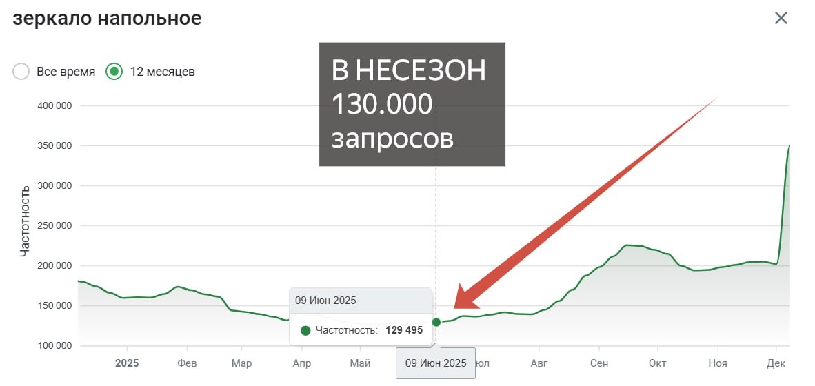 ↖️📌РАЗБОР ТОВАРА: Напольное зеркало - это не про «моду», это про стабильный бытовой спрос. ✅По каждому фильтру есть скрин. Но давайте прогоним его через наши 10 фильтров и посмотрим, где скрывается золотая жила. 📈 ФИЛЬТР 1: ТРЕНД — СТАБИЛЬНЫЙ И ПРЕДСКАЗУЕМЫЙ Данные: Запросы «напольное зеркало» не падают даже летом (130К!). Сейчас, в сезон обновления интерьеров, спрос взлетает до 350 000 запросов в месяц. Вывод: Это не однодневка. Товар с устойчивым, циклическим спросом. Идеально для планового бизнеса. 🥊 ФИЛЬТР 2: КОНКУРЕНЦИЯ — МНОГО КАРТОЧЕК, МАЛО ИГРОКОВ Данные: На WB всего около 5000 карточек. Цифра кажется большой, но... Ключевая статистика: Из этих 5 тысяч продажи есть только у 276 карточек. Вывод: Рынок завален «мертвым» товаром. Реальная конкуренция - всего 5.5% от всех предложений. Это огромное окно возможностей. 💰 ФИЛЬТР 3-4-5: СПРОС, SEO И РЕКЛАМА — ВСЁ В НАШИ РУКИ Продажи: 274 живые карточки, которые продают на 35.000.000р ежемесячно Название: Ключевой запрос «напольно