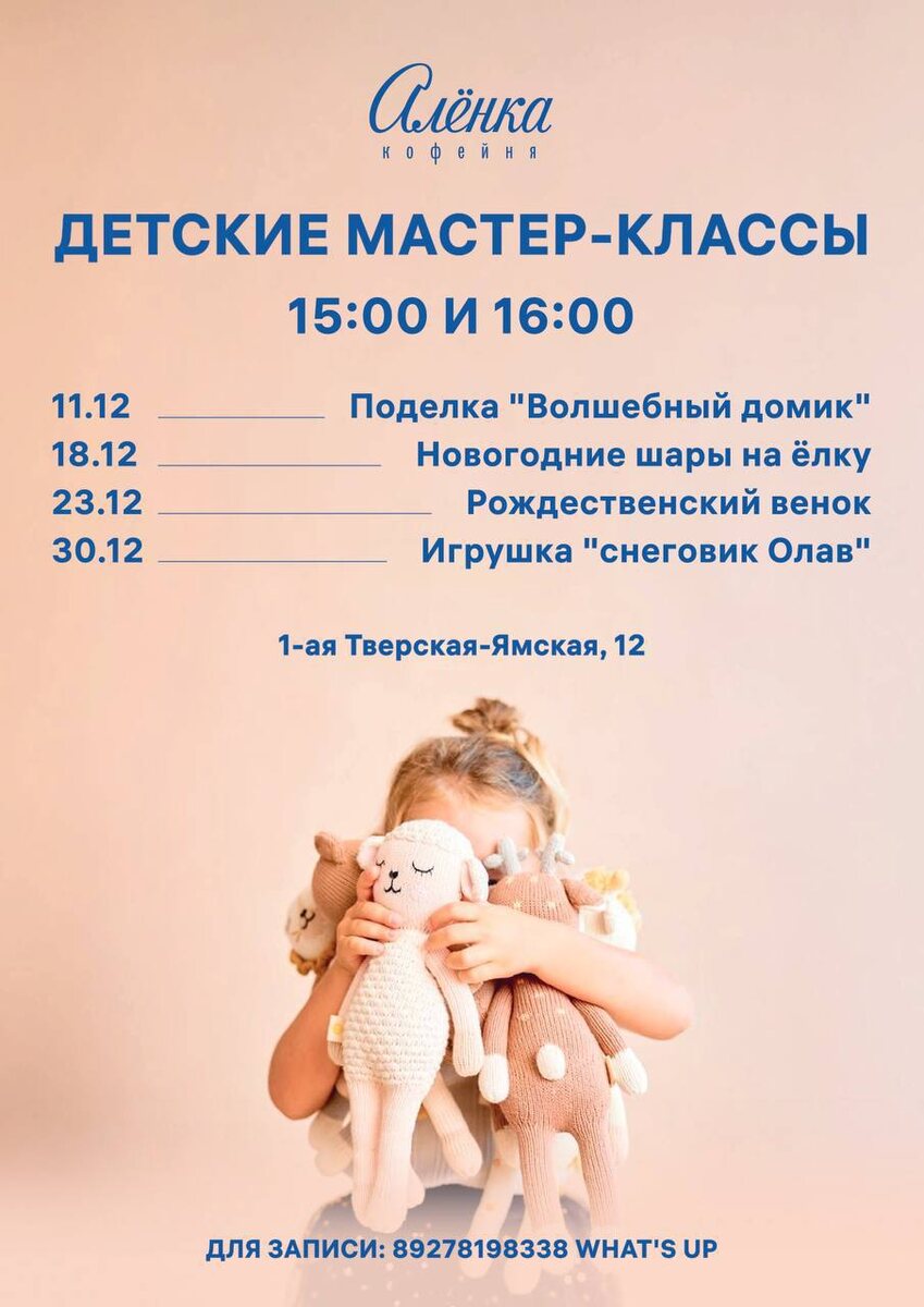 ⚡️⚡️Бесплатные новогодние МК в «Алёнке» на Тверской Алёнка запускает бесплатные детские мастер-классы до конца декабря! Запись по телефону в вотсапе ☎️ +79278198338, Анастасия Успевай записаться , количество мест ограничено. ✖️11 декабря - поделка Волшебный домик ✖️18 декабря - новогодние шары на ёлку ✖️23 декабря - Рождественский венок ✖️30 декабря - игрушка снеговик Олаф Записала Еву - главного фаната Алёнки в нашей семье ☺️