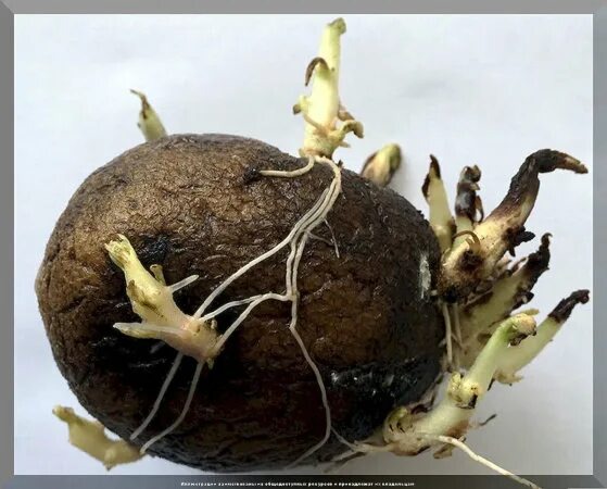 Выносить картофель на проращивание нужно за месяц до его посадки в грунт. Пророщенный клубень раньше всходит и урожай быстрее созревает. Заниматься проращиванием нужно в теплом помещении. Клубни кладут в в ящики и закрывают черным материалом. Можно поместить ящики просто в темное и теплое помещение, если оно у вас есть. Температура для проращивания должна быть выше +10 градусов. Через, примерно, 2-3 недели на клубнях появляются ростки. Если вы все сделали правильно, они будут этиолированные, т.е. белые, красноватые, синеватые, в зависимости от сорта, но не зеленые. Зелеными ростки бывают, если проращивать клубень на свету. Клубень с световыми ростками дает меньший урожай. Про правильное проращивание, читайте: Нередко бывает, что кончики ростков чернеют. ПРИЧИНЫ Клубень картофеля поражен вирусом. Сажать его не стоит. и хорошего урожая не будет. Если много клубней с черными ростками, то значит ваш сорт выродился и его нужно менять. Но бывает и так, что при своем росте ростки клубня у