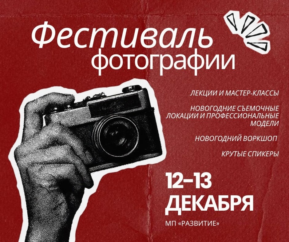 Молодежное пространство "Развитие" приглашает студентов ГИКИТ стать участниками фестиваля фотографии 📸 В программе — два дня вдохновения, знаний и творчества. Рассказываем про лекции: ⚪️«Продюсер фотосъёмки» от Марии Севрюковой — практикующего фотографа, эксперта в мобилографии и классической фотографии. ⚪️«Продвижение фотохудожников» от Татьяны Гомоновой — дизайнера и куратора галереи современного искусства ⚪️«Как начать получать публикации в международных журналах» от Евгении Сатовой — фэшн-фотографа с 13-летним стажем, основателя собственной студии и опытного преподавателя. ⚪️ «Свет в фотографии» от Ксении Подзоровой — портретного фотографа, создающего эмоциональные и глубокие образы. ⚪️«Секреты репортажной съёмки» от Тимофея Даудриха —профессионального репортажного фотографа и преподавателя. На фестивале пройдет креативный воркшоп «Новогодние огоньки» про волшебную атмосферу на фотосессии от Юлии Шицко — руководителя студии «Твой кадр» с 5-летним опытом в репортаже, рекламе
