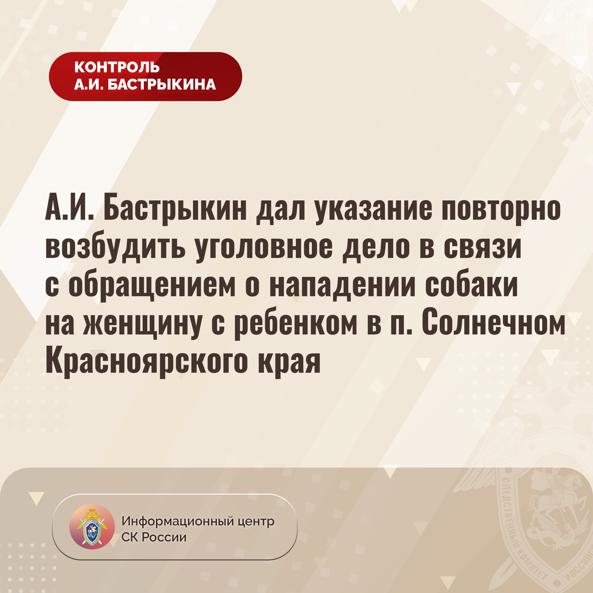 А.И. Бастрыкин дал указание повторно возбудить уголовное дело в связи с обращением о нападении собаки на женщину с ребенком в п. Солнечном Красноярского края В Информационный центр СК России обратилась жительница Красноярского края по вопросу несогласия с результатами установления обстоятельств нападения собаки на нее и ее шестилетнего ребенка в поселке Солнечном. В сентябре текущего года животное, находившееся на самовыгуле без поводка и намордника, набросилось на мальчика, после чего укусило заявительницу. Женщина получила травму, ей потребовалась медицинская помощь. Отмечается, что указанный случай не единичен, собака регулярно проявляет агрессию в отношении граждан, однако каких-либо мер к владельцу не принимается. Указанная ситуация освещалась в социальных сетях. Ранее А.И. Бастрыкин ставил ее на контроль в центральном аппарате ведомства. В ГСУ по Красноярскому краю и Республике Хакасия возбуждалось уголовное дело. Прокурор Ужурского района Хабаров Виктор Николаевич отменил пост