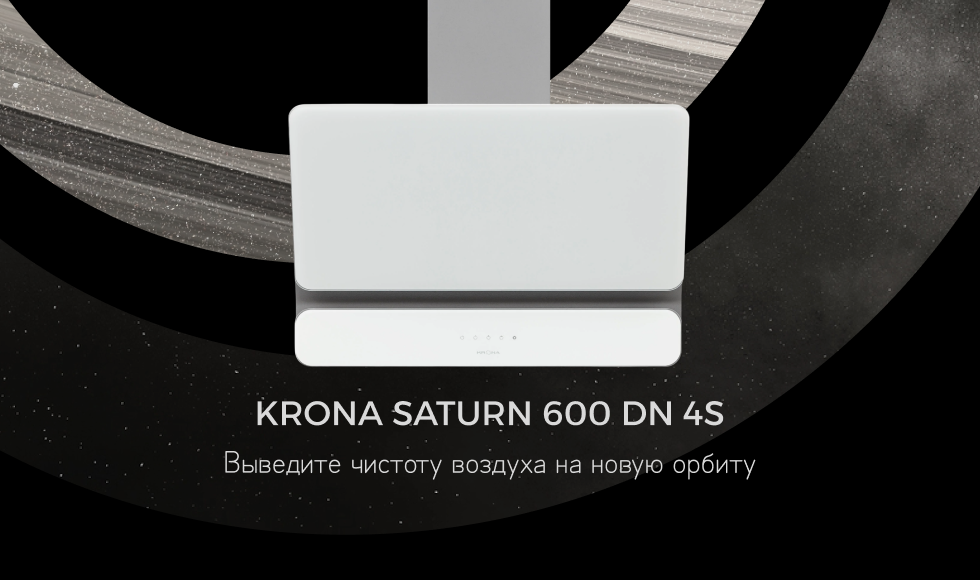 15 декабря 1966 года астроном Одуэн Дольфюс обнаружил десятый спутник планеты Сатурн. Позже найденный объект, верно сопровождающий планету сквозь века, получил имя Янус. На вашей кухне тоже может появиться надежный компаньон — вытяжка KRONA SATURN 600 DN 4S, чей неизменный спутник — чистый и свежий воздух. Эта современная, элегантная и надежная модель раскрывает новые горизонты комфорта и технологичности в доме, где дышится легко. SATURN 600 DN 4S — наклонная кухонная вытяжка шириной 60 см с изогнутой фронтальной панелью из закалённого стекла и металла в элегантных оттенках черного и белого. Модель оснащена мощным мотором с производительностью до 710 м³/ч, сенсорной панелью управления, газовым лифтом панели и энергоэффективной LED‑подсветкой. Эта вытяжка соединяет эстетику и практичность и станет отличным решением для кухонь любой площади, студий и квартир с европланировкой. Определенно да, если вам нужна современная, технологичная, надежная и долговечная вытяжка. Технические характери
