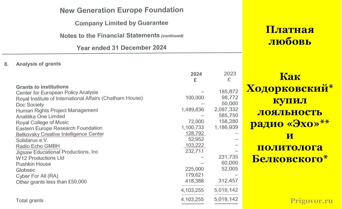 Prigovor.ru узнал, что в 2024 году фонд “New Generation Europe Foundation” заплатил “Radio Echo GMBH”£ 103,2 тыс., а политолог Станислав Белковский получил 128,8 тыс. фунтов стерлингов