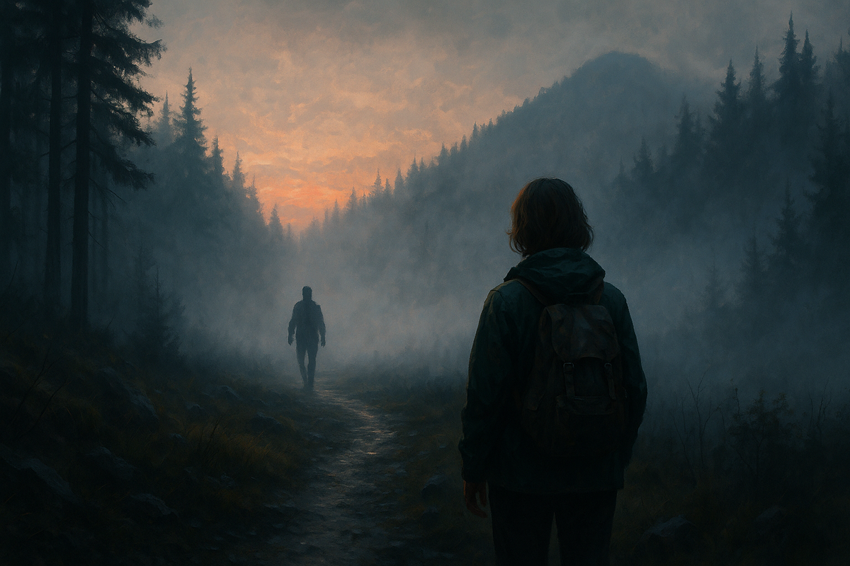 Чем дальше они уходили, тем гуще становился туман. Свет пробивался сквозь него странными лучами, так что казалось, тропа подсвечена снизу. Воздух был тёплым и пах смолой, мокрой землёй и чем-то сладковатым, почти знакомым — этим смешанным запахом мокрого камня и дешёвого туристического одеколона, который Сергей обожал.