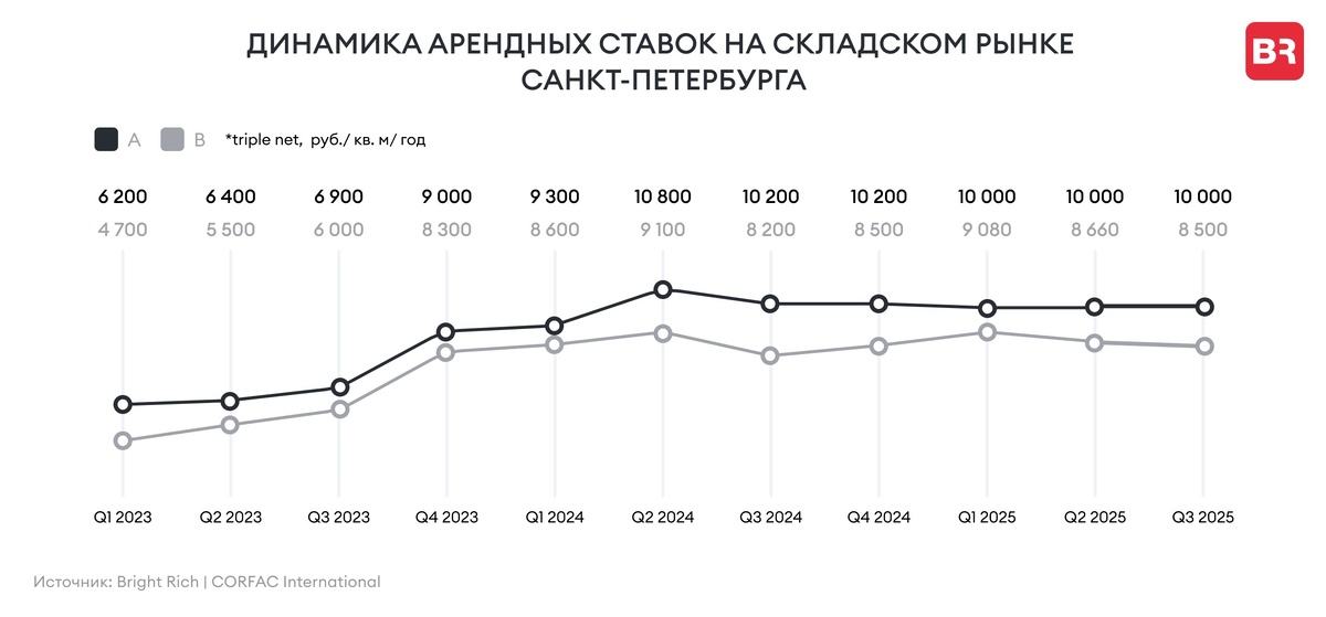 Средняя стоимость аренды складов класса А в Санкт-Петербурге и Ленинградской области в 2026 году сократится с 10 до 9,5 тыс. рублей за квадратный метр без учета НДС и операционных расходов. Такое снижение на 5% станет минимальным показателем с начала 2024 года, сообщает Bright Rich | CORFAC International. Падение ставок связано с ростом доли вакантных площадей на фоне снижения деловой активности и появлением новых спекулятивных объектов на рынке. К началу 2026 года валовый объем свободного предложения в регионе с учетом скрытой вакансии может достичь 696,4 тыс. квадратных метров или 12% от общего объема. Это станет максимальным показателем за шесть лет. window.yaContextCb.push(()=>{ Ya.adfoxCode.createAdaptive({ ownerId: 11637420, containerId: 'adfox_176583086913673978', params: { pp: 'hqaj', ps: 'kvpa', p2: 'jqfp' } }, ['desktop'], { tabletWid
