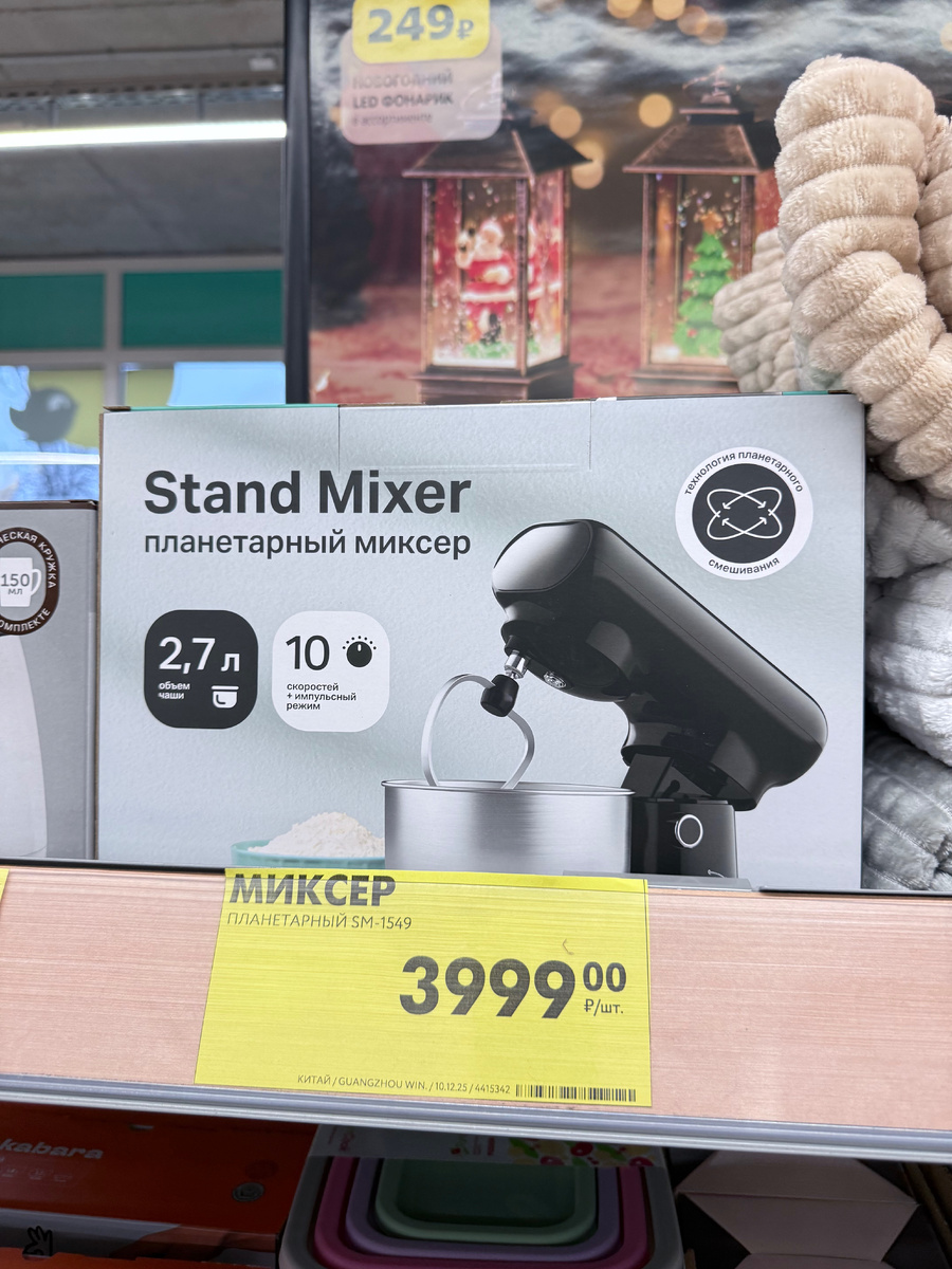 Начну традиционно с непродовольственного сегмента. Первым делом хочу обратить ваше внимание на планетарный миксер мощностью 1500 Вт, который оснащен 10 скоростями и имеет дополнительный импульсный режим.