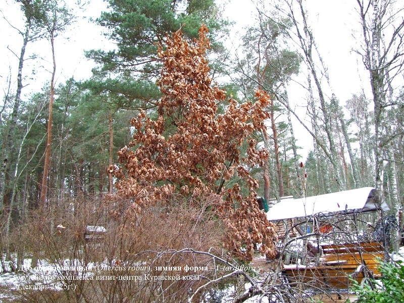 При посещении визит-центра национального парка невозможно не заметить необычный дуб, который не сбрасывает на зиму листву. Почему это происходит? Так бывает каждый год или только при определённых условиях? Это характерно для молодого дерева или встречается еще где-то на Куршской косе у деревьев преклонного возраста? Пробуем разобраться и подойти к вопросу не метафорически, а с ботанической точки зрения. Многие в детстве читали рассказ Юрия Нагибина «Зимний дуб», в котором описана красота зимнего леса и необычного дуба. Вот несколько предложений из этого произведения: «...Тропинка обогнула куст орешника, и лес сразу раздался в стороны. Посреди поляны в белых сверкающих одеждах, огромный и величественный, как собор, стоял дуб. Казалось, деревья почтительно расступились, чтобы дать старшему собрату развернуться во всей силе. Его нижние ветви шатром раскинулись над поляной. Снег набился в глубокие морщины коры, и толстый, в три обхвата, ствол казался прошитым серебряными нитями. Листва,