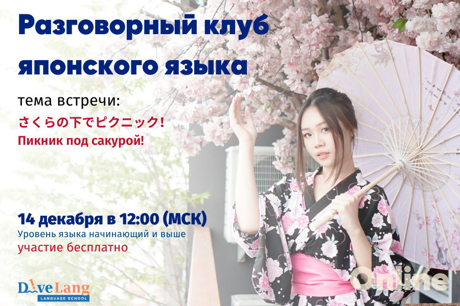 Тема встречи: さくらの下でピクニック!— Пикник под сакурой! Встречаемся 14 декабря 2025г в 12:00 (воскресенье) 👨🏫 Преподаватель: Виктор 📍 Онлайн, в Яндекс Телемост *чтобы без задержек присоединиться к встрече, скачайте приложение Яндекс Телемост Мы познакомимся с традицией Ханами, обсудим, что взять на пикник, как пригласить друзей и где удобнее всего расположиться. Ждём всех, кто интересуется японским языком! 👉 Регистрируйтесь и присоединяйтесь к клубу. Для регистрации на встречу, переходите в наш телеграм канал - https://t.me/divelang/1099 Или оставляйте заявку по ссылке на сайте Ждем всех желающих!