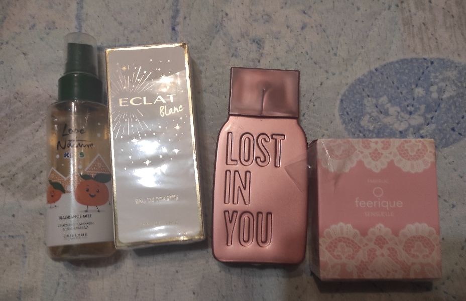 Добрый день, дорогие мои! Давно не было разговора про ароматы. Вот такие ароматы у меня в подборке - это спрей с мандаринками от Орифлейм,надо его добить пока предновогоднее время) Лост ин ю от Орифлейм - то нравится такой пудровый, вкусный, то грубоватый, двойственный для меня аромат, его не особо много осталось. Когда холода использую феерик сенсуэль от Фаберлик - красиво раскрывается в мороз, и корица, и сладость, у меня 30 мл. Ну и достала Экла Блан - аромат с нотами шампанского, лимитка, несколько лет уже достаю его и пользуюсь перед Новым годом. Пока ограничилась этими ароматами)
