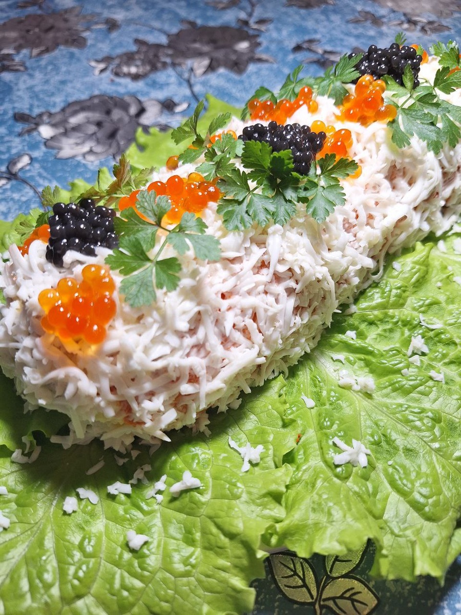 Четвертый слой натертые яйца, белок с двух яиц оставить для украшения. Смазываем майонезом.