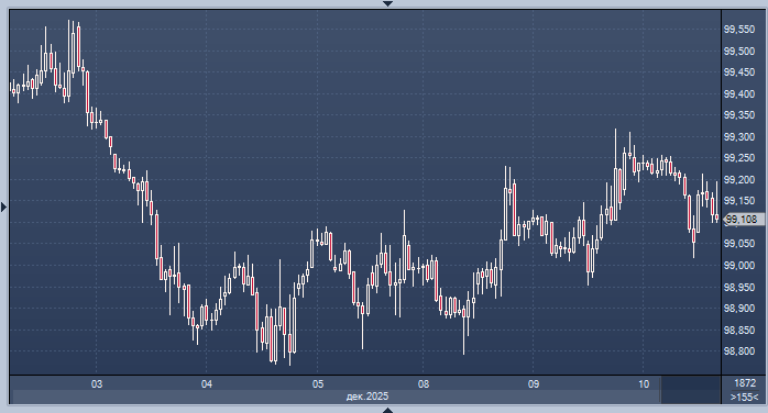 Ожидается, что Банк Японии повысит ставку в декабре, но в центре внимания фискальная политика. Евро поддерживается более "жестким" прогнозом по ставке График индекса доллара интервалами в 60 минут В среду американская валюта немного ослабла по отношению к евро и иене из-за ожидания заседания Федеральной резервной системы (ФРС), которое должно было состояться в тот же день. На этом заседании ожидалось снижение процентной ставки, которое аналитики называют «ястребиным». Инвесторы предполагают, что председатель ФРС Джером Пауэлл объявит о снижении ставки на 25 базисных пунктов и при этом представит ограничительные меры, чтобы успокоить тех, кто выступает за сохранение высоких ставок. «Совет управляющих ФРС сейчас наиболее разделён за последние пять лет, с двумя почти равными группами. Шесть членов склоняются к смягчению денежно-кредитной политики, включая двух, связанных с движением «Сделаем Америку снова великой», а шесть выступают за сохранение ставок без изменений», — отметил Кевин Тоз