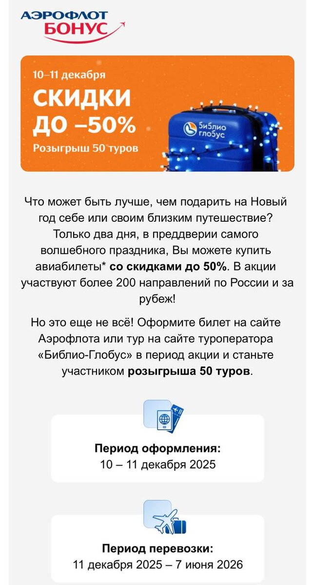 ‼️Аэрофлот анонсировал акцию: ДО - 50% НА ВСЕ АВИАБИЛЕТЫ‼️ Максимальный репост всем друзьям-путешественникам, такое нельзя пропускать. Все кто бронил туры - это тот самый день, когда можно урвать горячие билеты и сильно сэкономить на перелете😉. 📆Даты акции: 10-11 декабря