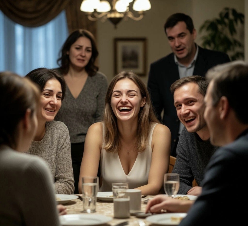 Они уже сидели за столом, когда мы вошли. Людмила Петровна в своём лучшем шёлковом платье, Геннадий Викторович в пиджаке, Игорь и Ольга — нарядные, с напряжёнными улыбками. Увидев нас, они заулыбались ещё шире, задвигали стульями.