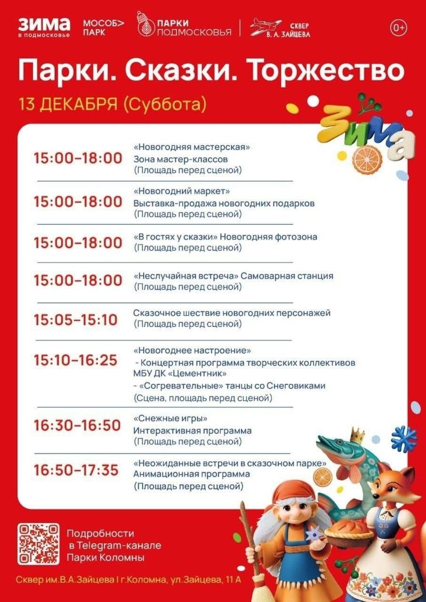 Детей и родителей приглашают на интерактивную программу "ПАРКИ. СКАЗКИ. ТОРЖЕСТВО", которая состоится 13 декабря с 15:00 до 18:00 в Сквере им. В. А. Зайцева. Всем желающим погрузиться в веселье и забавы предлагают принять участие в анимационной программе "Неожиданные встречи в сказочном парке", зажигательной интерактивной программе "Снежные игры" и "согревательных" танцах со Снеговиками "Деревенька Снеговнуково". Рядом с атмосферной фотозоной "В гостях у сказки" каждый сможет почувствовать волшебство приближающегося праздника и сделать фотографию на память. Вход на мероприятие свободный. 0+. #ГородскойОкругКоломна #Коломна #КоломнаZдесь #КоломнаОзёры #Подмосковье #НашеПодмосковье #Московскаяобласть