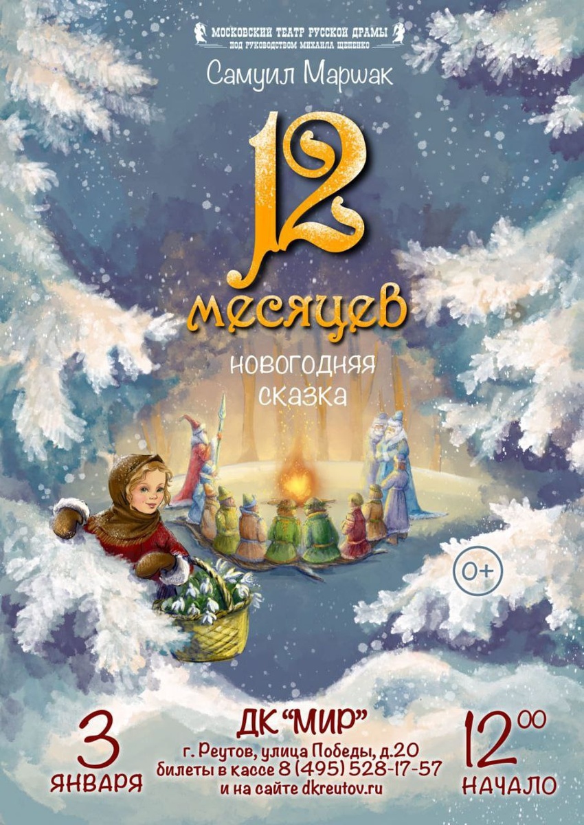 ËЛКИ В РЕУТОВЕ! Московский театр русской драмы п/р Михаила Щепенко ВОЛШЕБНАЯ НОВОГОДНЯЯ ИСТОРИЯ «ДВЕНАДЦАТЬ МЕСЯЦЕВ» по мотивам пьесы С. Маршака 3 января в 12-00 ДК «МИР» г.Реутов, ул. Победы, д.20 Билеты в кассе ДК и на сайте https://iframeab-pre9671.intickets.ru/seance/67607036/#abiframe скидка 20% для коллективов от 15 билетов, заказ по тел:8(977)505-67-98 скидка 15% по флаеру в кассе Если солдат не отпустит на волю принца-бродягу, если медведь в лесу не нападёт на королевскую свиту, если капризная принцесса неверно поставит запятую в предложении «казнить нельзя помиловать»…то удивительного новогоднего приключения может и не получится. Завораживающий сказочно-красивыми костюмами и музыкальной гармонией, спектакль Театра Русской Драмы разворачивает сюжет всем известной сказки С.Маршака совершенно непредсказуемо. Хотите узнать, почему не женится заморский принц на юной королеве? И какое желание загадают Госпожа Канцлер и Посол Западной Державы? Двенадцать братьев-месяцев помогут