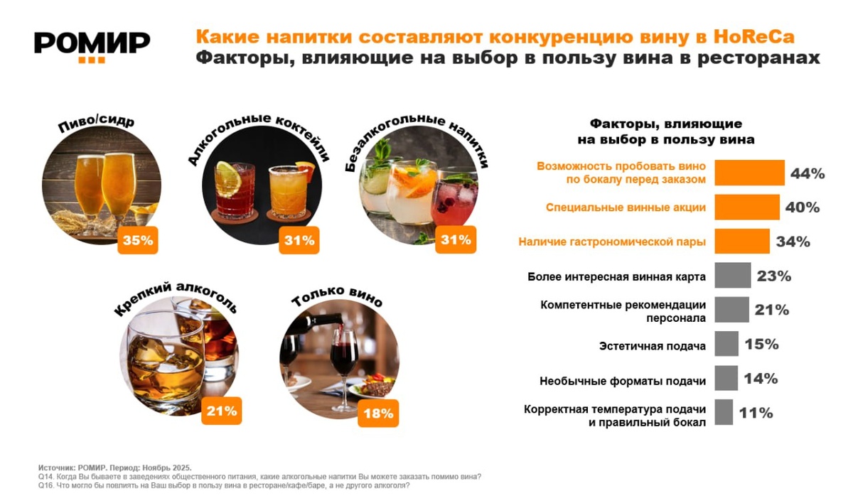 РОМИР выяснил, какие напитки составляют конкуренцию вину при заказе в ресторанах и кафе