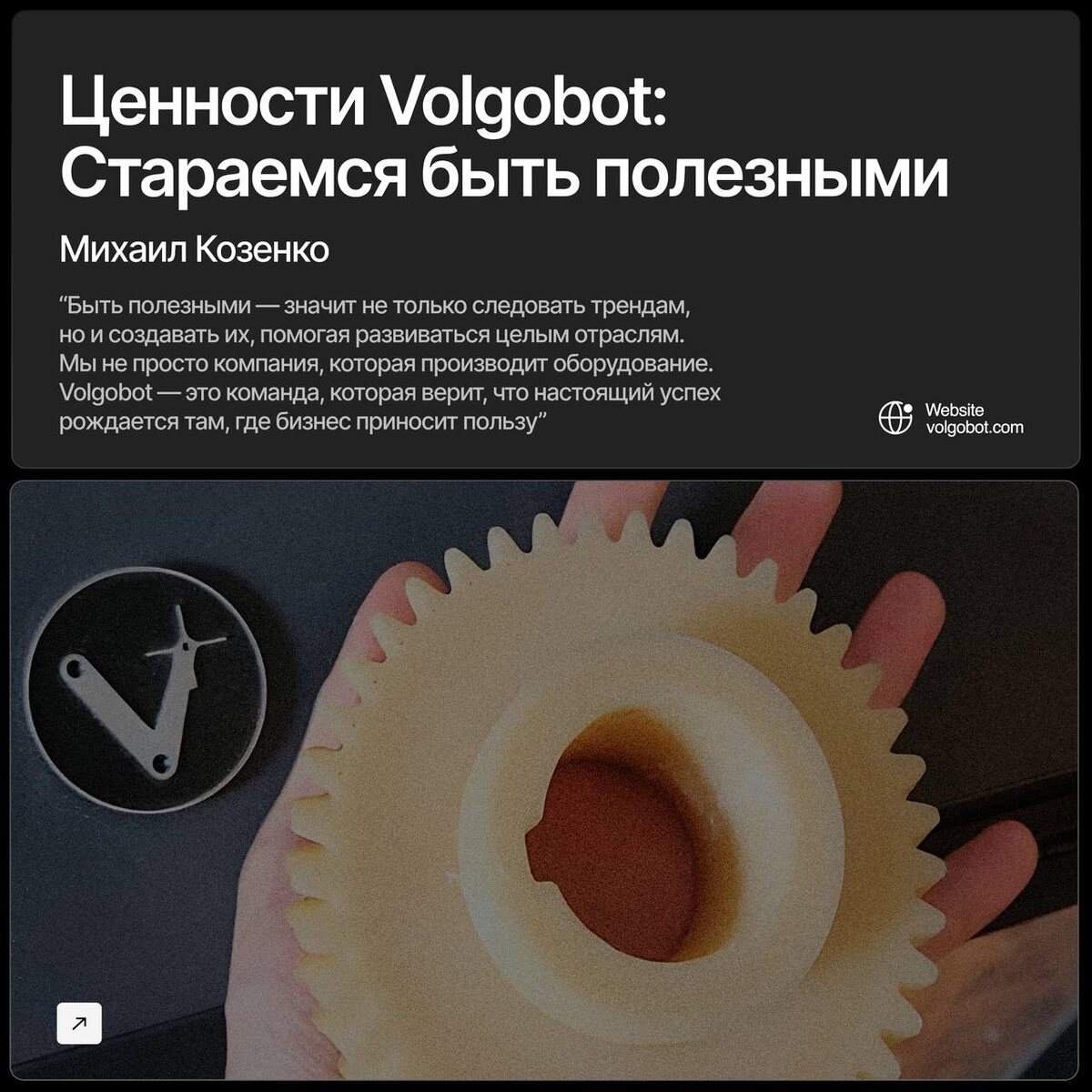 Ценности Volgobot: Стараемся быть полезными Продолжаем рассказывать о фундаменте, на котором строится наша компания. Сегодня — о ценности, которая для нас первична: мы стараемся быть полезными. Мы уверены, что бизнес должен приносить реальную пользу, решать сложные задачи наших клиентов и вносить вклад в развитие ключевых отраслей. Наша философия строится на принципе взаимовыгодного обмена: когда мы приносим пользу обществу и нашим партнерам, тогда и приходим к общему успеху. Как это работает на практике? Мы не просто продаём 3D-принтеры. Мы предлагаем технологические решения, которые становятся частью прорывных проектов. Вот лишь несколько примеров: • В инжиниринге и дизайне: Компания 3DREX использует принтер Volgobot A4 PRO для печати прочных корпусов, шестерен, узлов и деталей из полиамидных материалов, где требуется повышенная прочность и стойкость. • В машиностроении: НПК «ГЕРМЕТИКА» применяет Volgobot A4 PRO для изготовления вспомогательных элементов торцовых уплотнений. Вне