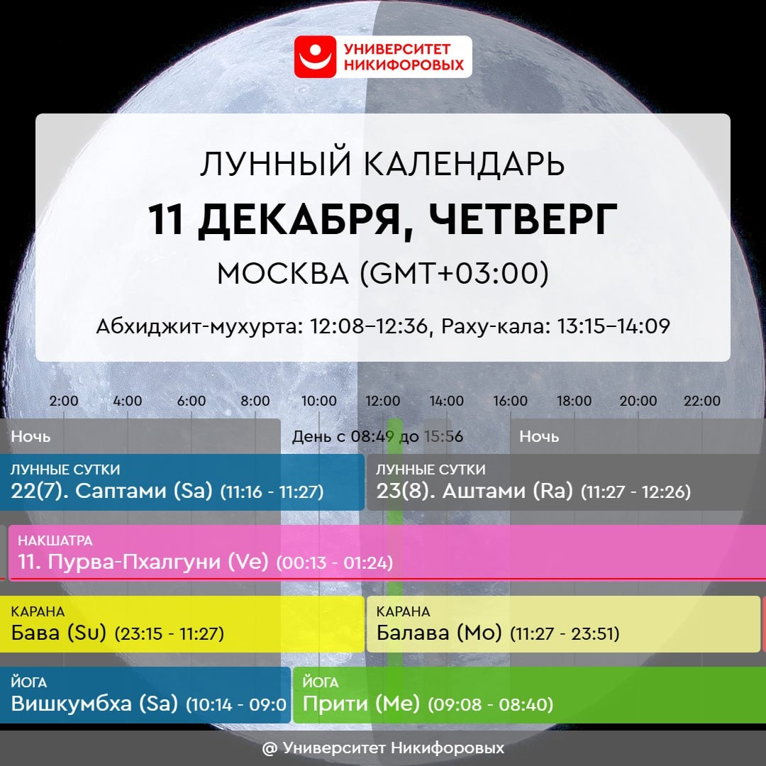 11 ДЕКАБРЯ, ЧЕТВЕРГ Энергетика дня в целом не самая благоприятная, тем не менее она подходит для дел, в которых требуется использование личной харизмы и власти. Можно успешно взаимодействовать с госорганами для решения насущных вопросов, а также осуществлять конфронтацию там, где это необходимо. Это не тот день, когда стоит полагаться лишь на смирение и терпение, это время позволить себе проявить свою силу. Хорошо будет найти время для творчества и искусства, например посетить мастер-класс по рисованию или почитать об известных художниках. Можно сходить на концерт или послушать любимую музыку дома. Также это подходящий момент для релаксации и отдыха. Можно устроить романтический вечер или просто позволить себе предаться ленности – полежать с книгой на диване или посмотреть сериал.