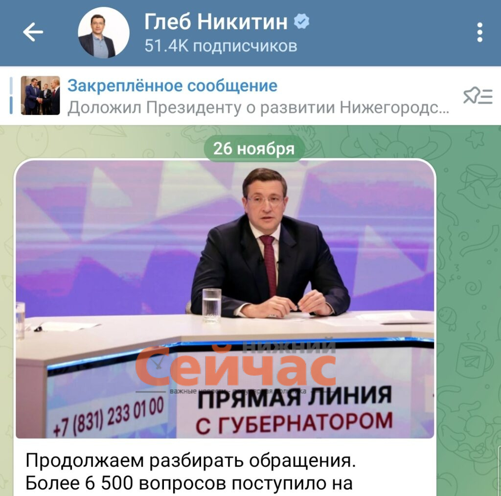 Губернатор Нижегородской области Глеб Никитин вошел в десятку самых упоминаемых в Телеграм-каналах глав регионов России по итогам ноября. Данные публикует Аналитический центр «Г.У.Р.У.». За месяц в федеральных и региональных СМИ было опубликовано около 21 тысячи упоминаний о главе Нижегородского региона, и по итогам Глеб Никитин поднялся на 6-е место в медиарейтинге. В тройку лидеров рейтинга вошли мэр Москвы Сергей Собянин, губернатор Курской области Александр Хинтштейн и глава Ростовской области Юрий Слюсарь. Нижегородского губернатора Телеграм-каналы чаще всего упоминали и цитировали в связи с такими темами как День народного единства, отправка гуманитарного груза в зону специальной военной операции, участие губернатора и помощника президента России Владимира Мединского в запуске конкурса на создание памятника русской Свободе. Кроме того, в ноябре обсуждалась встреча главы региона с нижегородским бизнес-сообществом и проведение всероссийской научно-практической конференции по вопрос