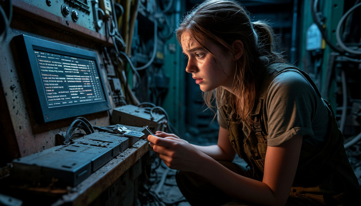 Анна пробиралась между свисающими проводами, чувствуя себя внутри гигантского, умершего кита. И тут её взгляд упал на одну из полуоткрытых технических панелей. За ней, в глубине ниши, слабо светился экран. Не большой, как в той лаборатории, а небольшой, прямоугольный дисплей, встроенный в пульт с физическими кнопками — похожий на старый банкомат или терминал для служебного доступа.