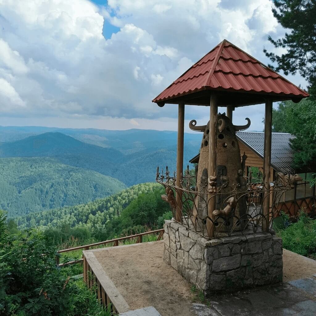 Смотровая площадка. Пространство на вершине благоустроено: есть ограждения, лавочки, беседка. Это идеальное место для медитации, пикника (убирая за собой мусор) и, конечно, для фотосессии. Вид на город-курорт Белокуриху отсюда как на ладони: видны все санатории, улочки и окрестные холмы. Также открываются панорамы предгорных равнин и Чергинского хребта.