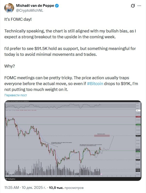 Сегодня день заседания FOMC! С технической точки зрения, график по-прежнему соответствует моему бычьему настрою, так как я ожидаю сильного прорыва вверх в ближайшую неделю. Я бы предпочёл видеть уровень $91,5 тыс. в качестве поддержки, но сегодня важно избегать минимальных движений и сделок. Почему? Заседания FOMC могут быть довольно коварными. Ценовое движение обычно заманивает всех в ловушку перед реальным движением, поэтому даже если биткоин упадёт до $91 тыс., я не придаю этому слишком большого значения.