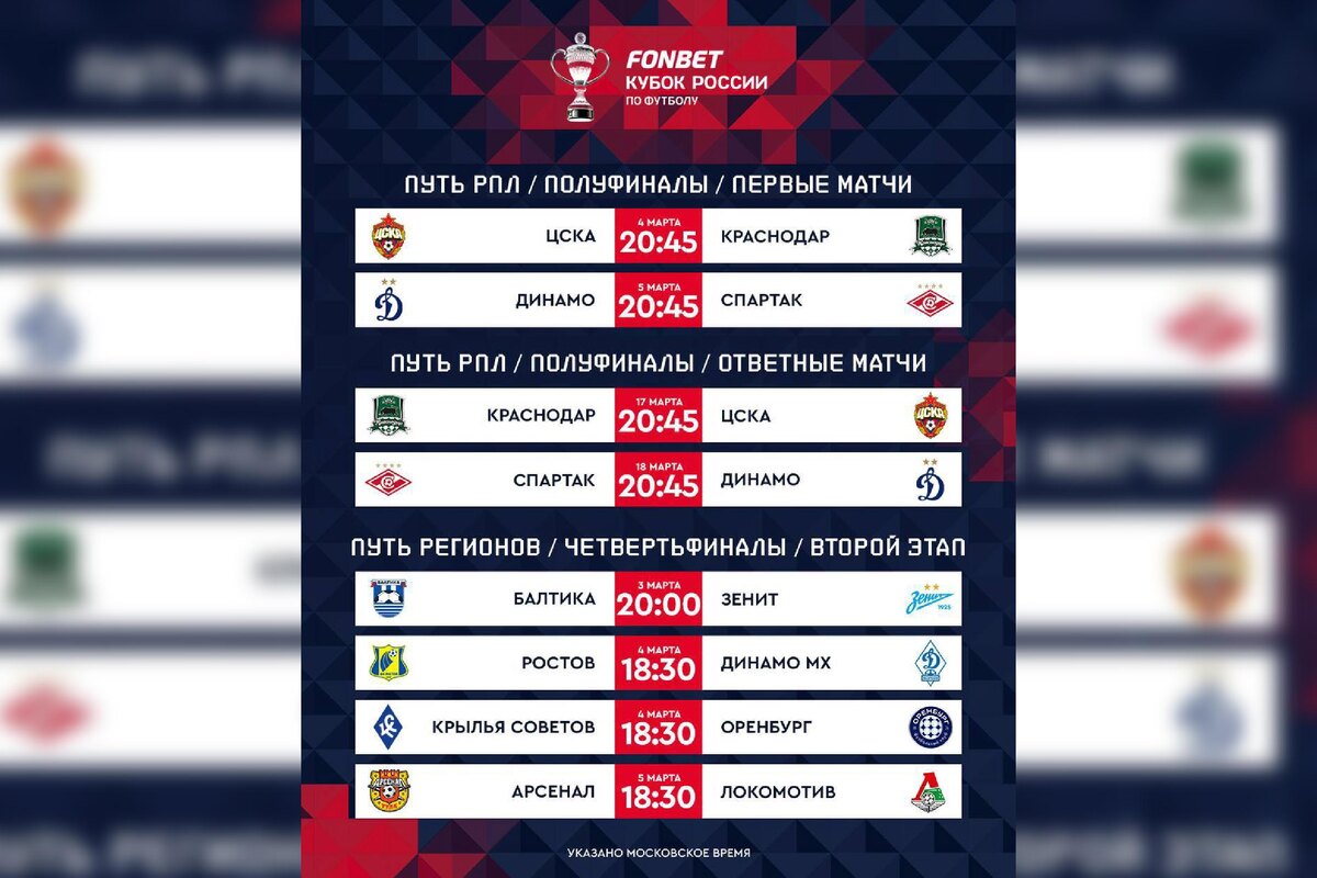 Российский футбольный союз (РФС) утвердил расписание весенней части матчей FONBET Кубка России. Петербургский «Зенит» сыграет против калининградской «Балтики» во вторник, 3 марта, начало матча в 20:00. Это будет второй этап противостояния в 1/4 финала, по итогам которого определится полуфиналист турнира. Остальные четвертьфинальные пары в Пути регионов сыграют 4 и 5 марта. «Ростов» примет «Динамо» из Махачкалы, самарские «Крылья Советов» сыграют «Оренбургом», а тульский «Арсенал» с московским «Локомотивом». Параллельно стартуют полуфиналы Пути РПЛ. Первые матчи пройдут 4 и 5 марта: ЦСКА сыграет с «Краснодаром», а московское «Динамо» – со «Спартаком». Ответные встречи состоятся 17 и 18 марта. Победители этих пар определят финалистов Кубка России. Все матчи пройдут по московскому времени. Ранее мы писали о том, что cпортсмены петербургского клуба «Турбостроитель» стали чемпионами третьего сезона Fonbet Континентальной лиги дзюдо.