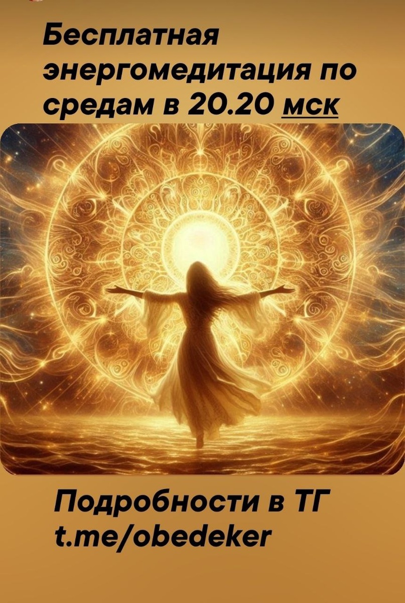 ✨Продолжаем цикл еженедельных энергомедитаций, направленных на ваше глубокое восстановление и наполнение жизненной силой! Каждую среду мы будем собираться вместе, чтобы целенаправленно работать с вашим внутренним ресурсом: · Наполнить ваше тело энергией здоровья: если вы чувствуете физическое недомогание, слабость или просто хотите укрепить свой жизненный тонус. · Восстановить психологический баланс: если вы столкнулись с состоянием «обесточивания», истощения или эмоциональной усталости. · Притянуть потоки энергии изобилия: каждая наша практика также будет направлена на раскрытие вашего денежного канала и увеличение финансового потока. Мы пробудем в практике около 30-40 минут — этого времени достаточно, чтобы настроиться, глубоко погрузиться в процесс и принять столько энергии, сколько нужно вашему телу. Участие безоплатное, от чистого сердца — во благо вашего гармоничного состояния! Приходите, чтобы подарить себе это время глубокого восстановления и осознанной заботы о себе. Я буд