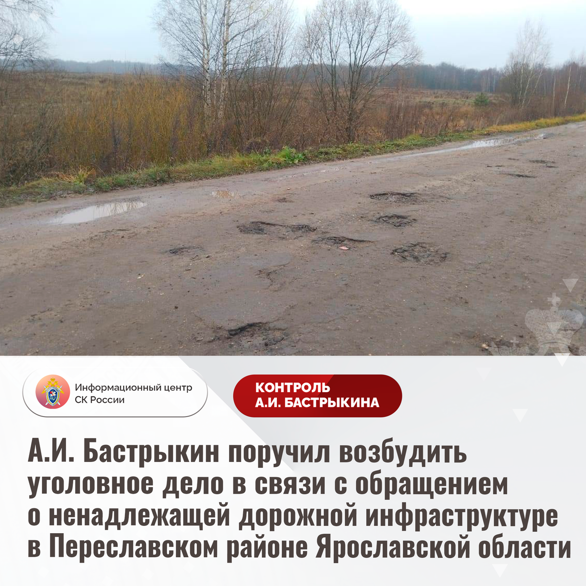 А.И. Бастрыкин поручил возбудить уголовное дело в связи с обращением о ненадлежащей дорожной инфраструктуре в Переславском районе Ярославской области В комментариях в аккаунте Информационного центра СК России «ВКонтакте» опубликовано обращение по вопросу нарушения прав жителей Переславского района Ярославской области. Длительное время участок автомобильной дороги «Кабанское - Алексино» находится в непригодном состоянии: асфальтовое покрытие разрушается, на поверхности образовались многочисленные ямы. В результате проезд по нему представляет опасность для участников дорожного движения. Кроме того, движение общественного транспорта, в том числе школьного автобуса, ограничено. Многочисленные обращения в различные инстанции результатов не принесли, мер к проведению ремонтных работ не принимается. В СУ СК России по Ярославской области организована процессуальная проверка. Председатель Следственного комитета Российской Федерации Александр Иванович Бастрыкин поручил руководителю СУ СК Росси