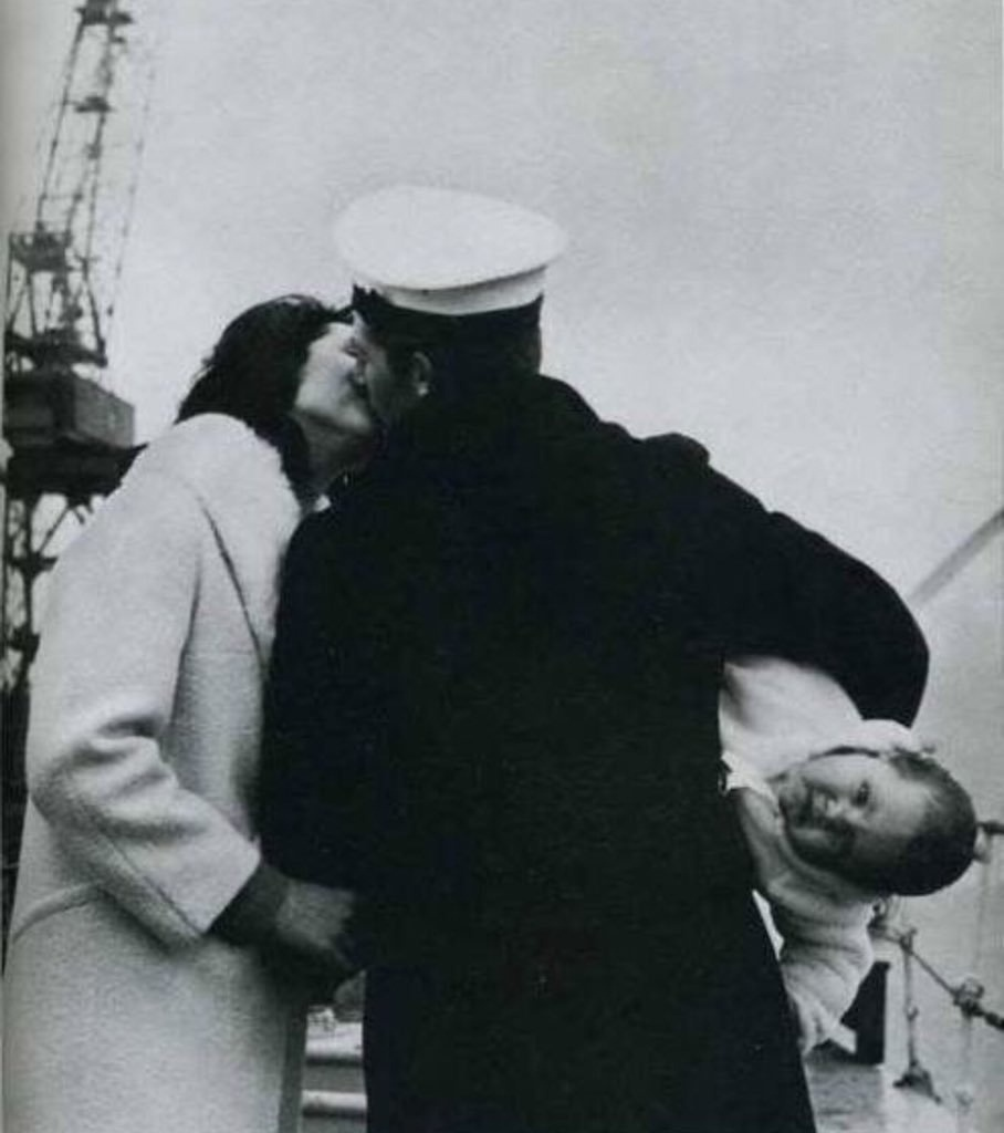 На этом трогательном снимке запечатлён момент воссоединения семьи: матрос поднимает ребёнка на руки, а на заднем плане виднеется порт, недавно наполненный командами и сиренами. Здесь нет парадов и маршей — только тихая, интимная радость встречи после долгой разлуки.