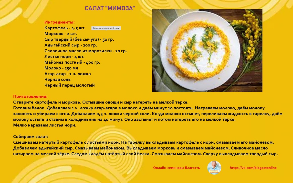🥗 САЛАТ "МИМОЗА" 🌀 Ингредиенты: Картофель - 4-5 шт. Морковь - 2 шт. Сыр твердый (без сычуга) - 50 гр. Адыгейский сыр - 200 гр. Сливочное масло из морозилки - 20 гр. Листья нори - 4 шт. Майонез постный - 400 гр. Молоко - 250 мл Агар-агар - 1 ч. ложка Черная соль Черный перец молотый 🌀 Приготовление: Отварите картофель и морковь. Остывшие овощи и сыр натереть на мелкой терке. Готовим белок. Добавляем 1 ч. ложку агар-агара в молоко и даём минут 10 постоять. Нагреваем молоко, даём молоку закипеть и убираем с огня. Добавляем 0,5 ч. ложки черной соли. Когда молоко остынет, переливаем жидкость в тарелку, даём молоку остыть и ставим в холодильник на 40 минут. Оно застынет и потом натереть его на мелкой тёрке. Мелко нарезаем листья нори.
