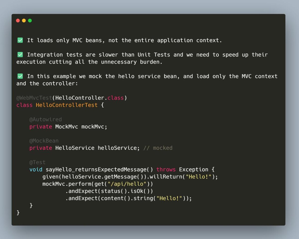 ⚡️ Совет по Spring Boot 💡 Если нужно написать интеграционные тесты для Spring MVC-контроллеров и замокать всё остальное — используй @WebMvcTest. Эта аннотация поднимает только MVC-слой (контроллеры, маппинг, валидацию), не загружая весь контекст приложения. Это делает тесты быстрее, чище и проще. #SpringBoot #JavaDev