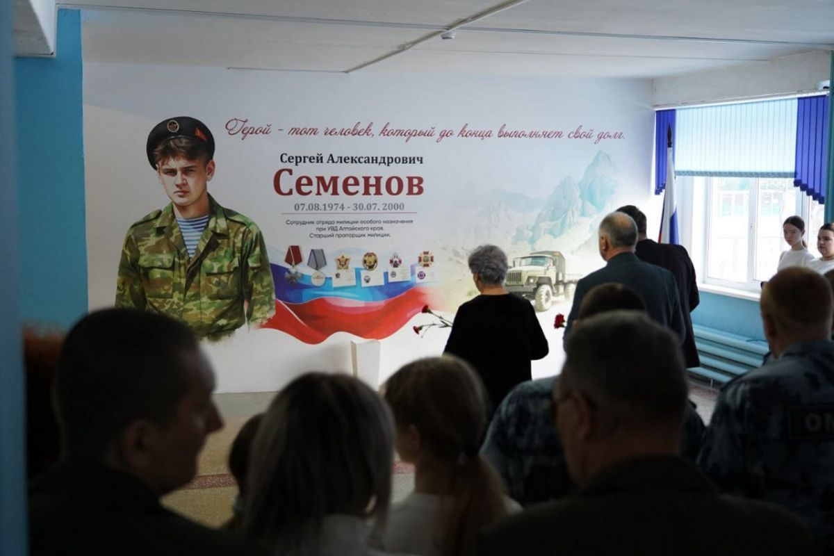 В День Героев Отечества, 9 декабря, в барнаульской школе №113 имени Сергея Семенова состоялось торжественное открытие мурала в его честь в рамках партийного проекта «Лица Героев» и при поддержке генерального директора строительной компании «СОЮЗ» Владимира Отмашкина. В памятном мероприятии вместе с учениками и педагогами школы, сотрудниками и ветеранами ОМОН приняла участие депутат Барнаульской городской Думы, координатор партпроекта Марина Понкрашева. В этом году исполнилось 25 лет со дня гибели во Второй чеченской войне старшего прапорщика милиции, заместителя командира моторизованного взвода ОМОН Сергея Семенова. «Летом 2000 года он ехал за рулем «Урала» по Заводскому району Грозного. Машина подорвалась на фугасной мине и была обстреляна боевиками. Раненый Сергей Семенов занял оборону и дал возможность своим товарищам отойти в безопасное место, но сам погиб. Он был удостоен ордена Мужества посмертно. В школе №113 помнят своего ученика, поддерживают связь с родителями и воспитывают